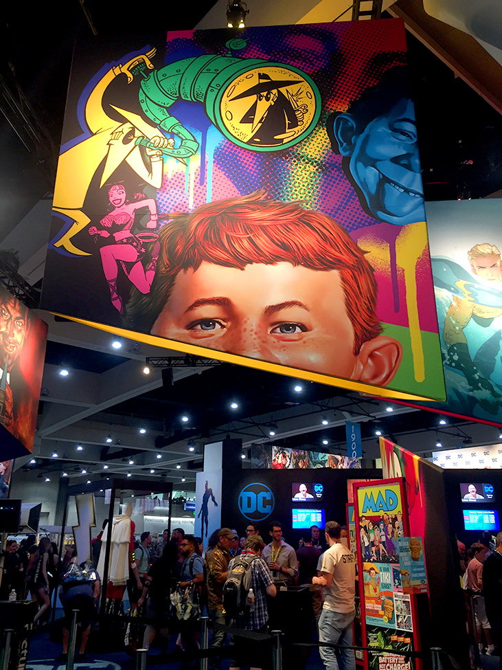 For the first appearance of "new" MAD at Comic-Con International San Diego, I redesigned our floor space and signage to be reflective of the new branding. From the ceiling hung an enormous 12-foot by 14-foot graphic. Beneath it was a wall of imagery, including a life-sized Alfred E. Neuman as Batman for photo opportunities. On the other side of this was a grid of posters, all highlighting our first three issues.